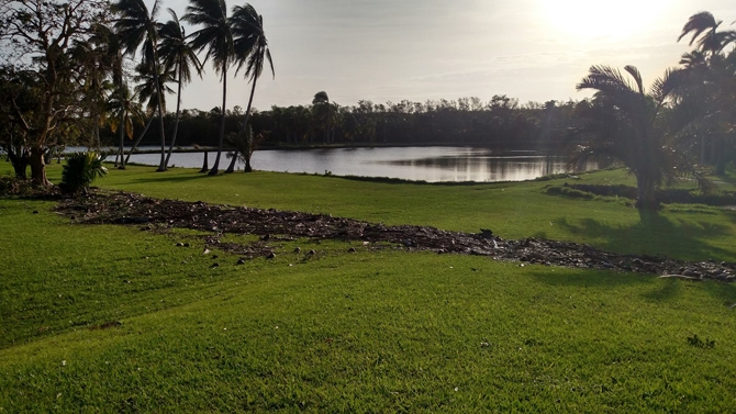 Major loss of fronds can be seen in this comparison. Some palms were also lost right near the building, on the right side.